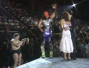 In 1988, I came home from school and my older sister, Jenny, was sick so she stayed home from school and was watching WWF WrestleMania IV on Coliseum Video. She was watching the Finals of the WWF World Heavyweight Championship Tournament between Randy”Macho Man”Savage [with: Miss Elizabeth] against “Million $ Man” Ted DiBiase [with: “The Eighth Wonder of the World” Andre The Giant]. While I didn’t become an instant fan of pro-wrestling, it definitely peaked my interest. The next time I encountered the World Wrestling Federation (WWF), I instantly fell in love with it. This time, Jenny was in the kitchen watching WWF Wrestling Spotlight while my Mom was cooking supper. The episode was showing the interview with the new WWF World Heavyweight Champion: Randy”Macho Man”Savage and Miss Elizabeth when Andre The Giant and Bobby”The Brain”Heenan distracted him long enough for DiBiase to attack “Macho Man” while Virgil held Elizabeth and forced her to watch the vicious attack.