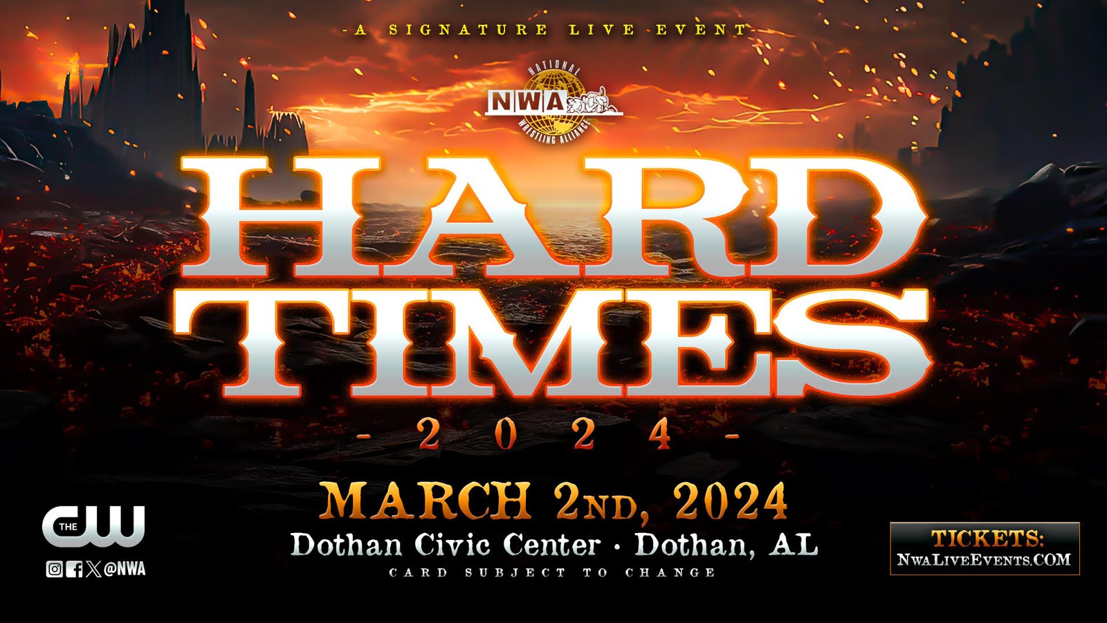 Hard Times 2024 is poised to reignite wrestling fervor in Dothan, and the NWA invites fans to be part of this historic event. Join us March 2, 2024, at the Dothan Civic Center for an unforgettable night of NWA wrestling action.
