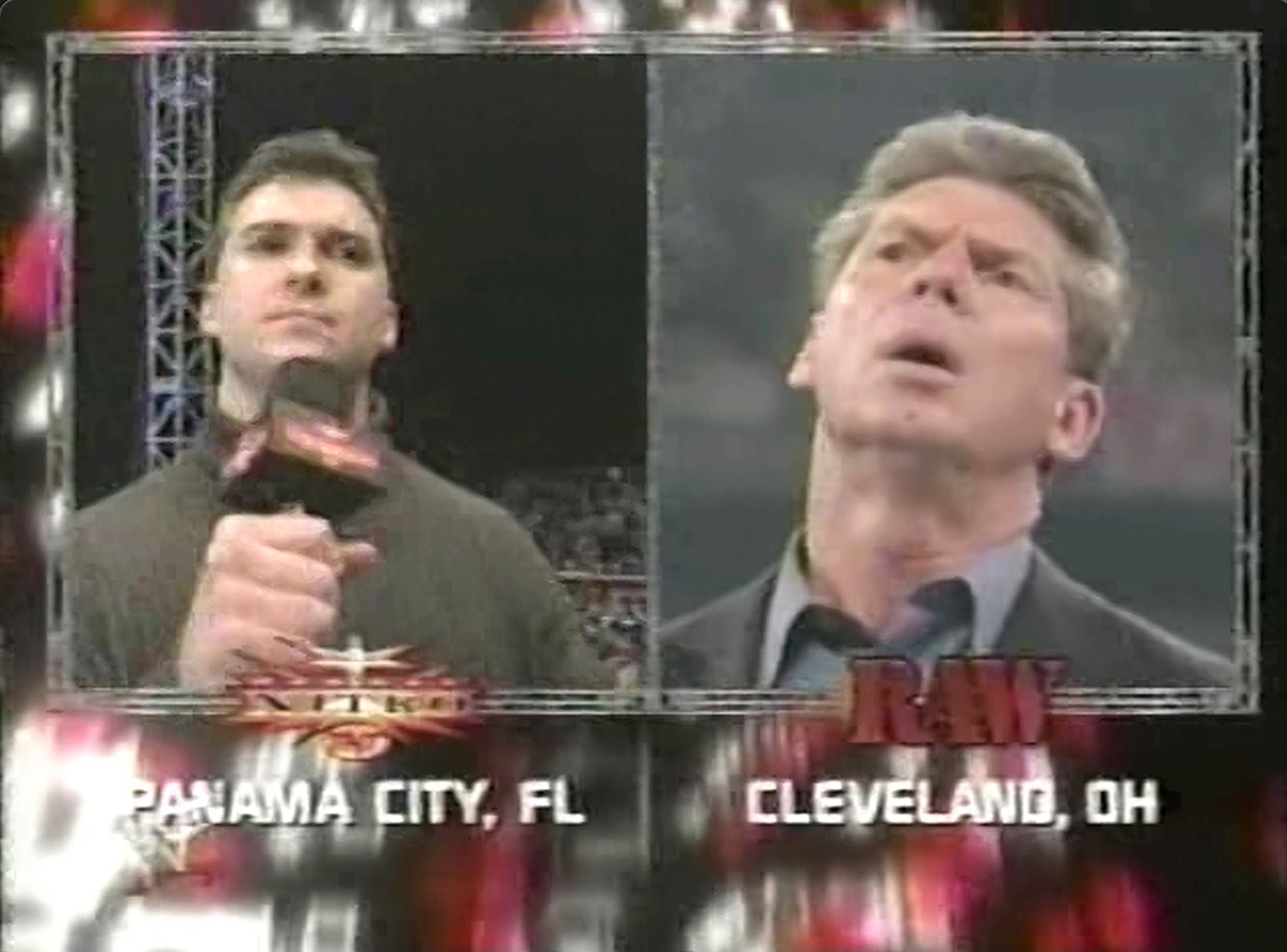 The most historic moment in wrestling history: Shane McMahon on "WCW Monday Nitro" and Vince McMahon on "WWF RAW is WAR."  (Photo Credit: WWE)