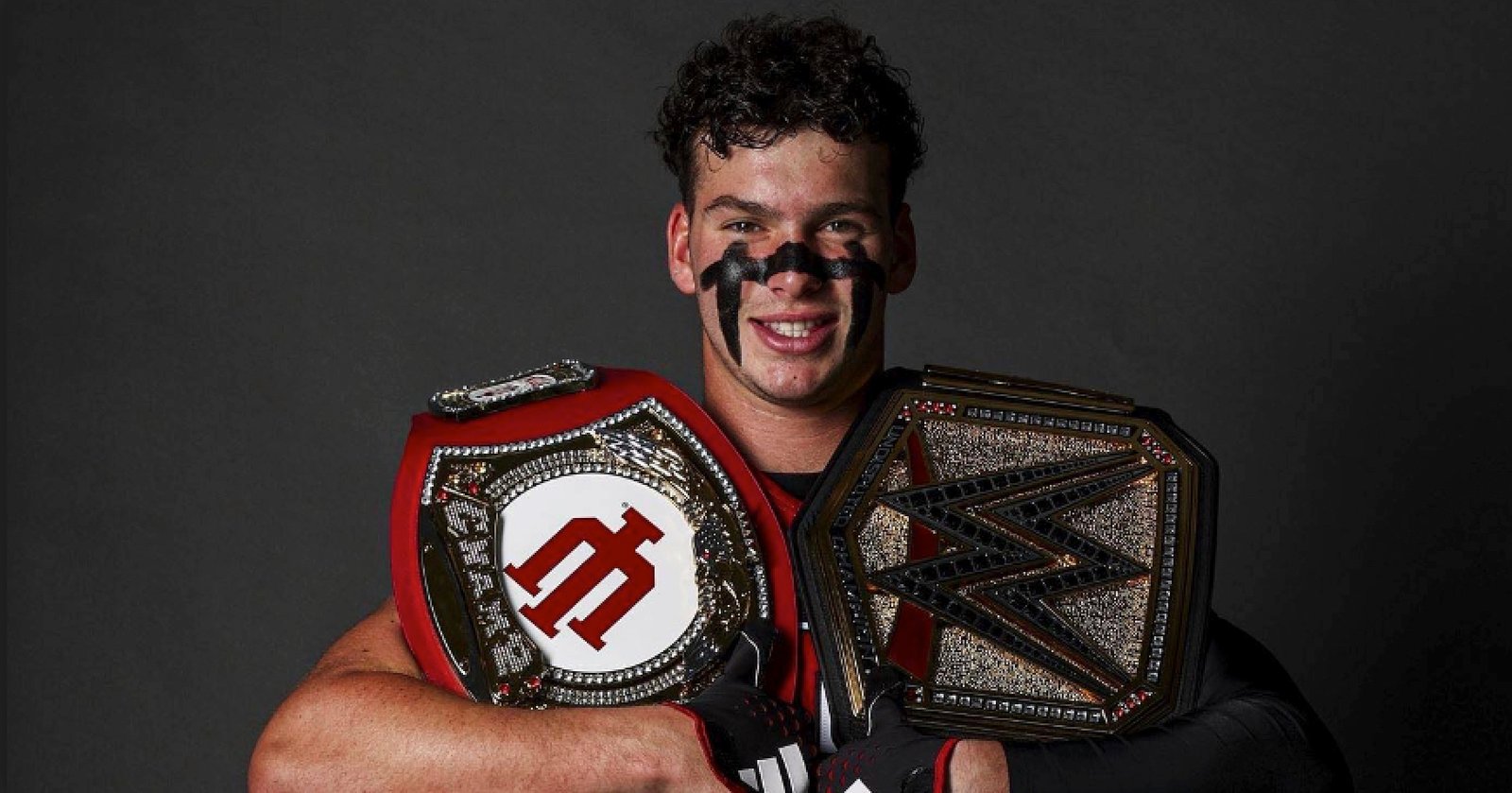 When WWE brought its Fastlane premium live event to Gainbridge Fieldhouse last year, Declan and members of the IU Hoosiers Football team attended the PLE and laying on Declan’s left shoulder was a championship spinner belt with the IU logo as the center plate. A video about the origin of the IU Takeaway Belt was released a few days later.