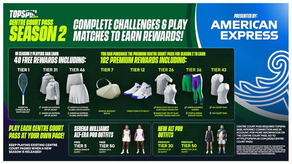 In TopSpin 2K25 Season 2, a host of unlockable white cosmetic Wimbledon rewards will be available to earn, plus an array of new items available in the Pro Shop, as well as American Express-themed cosmetic items unlockable in Centre Court Pass Season 2, including a racket, wristbands, jacket, shorts, tights, tank tops, and more. Also available as unlockable rewards in Centre Court Pass Season 2 are two alternate attires for cover icon Serena Williams, including the attire she wore in her 2015 Wimbledon victory, available to players who reach Free Tier 5, and her US Open 2016 outfit, available to players who reach Free Tier 50. Players who purchase the Premium Centre Court Pass for Season 2 will also have the opportunity to earn and unlock alternate outfits for pros Iga Swiatek and Matteo Berrettini.