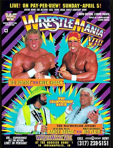 The first time Indianapolis hosted WrestleMania was on Sunday, April 5, 1992 at The Hoosier Dome. It was WWF WrestleMania VIII which featured such matches as Intercontinental Champion “Rowdy” Roddy Piper defending the title against Bret”The HitMan”Hart, The Natural Disasters challenging the WWF Tag Team Champions Money Incorporated, WWF Champion “Nature Boy” Ric Flair defending the title against Randy”Macho Man”Savage – which featured a young Shane McMahon as a member of the WWF officials attempting to keep Savage’s wife, Elizabeth, away from ringside, and “The Immortal” Hulk Hogan going on-on-one with Sid Justice – which featured the return of The Ultimate Warrior.
