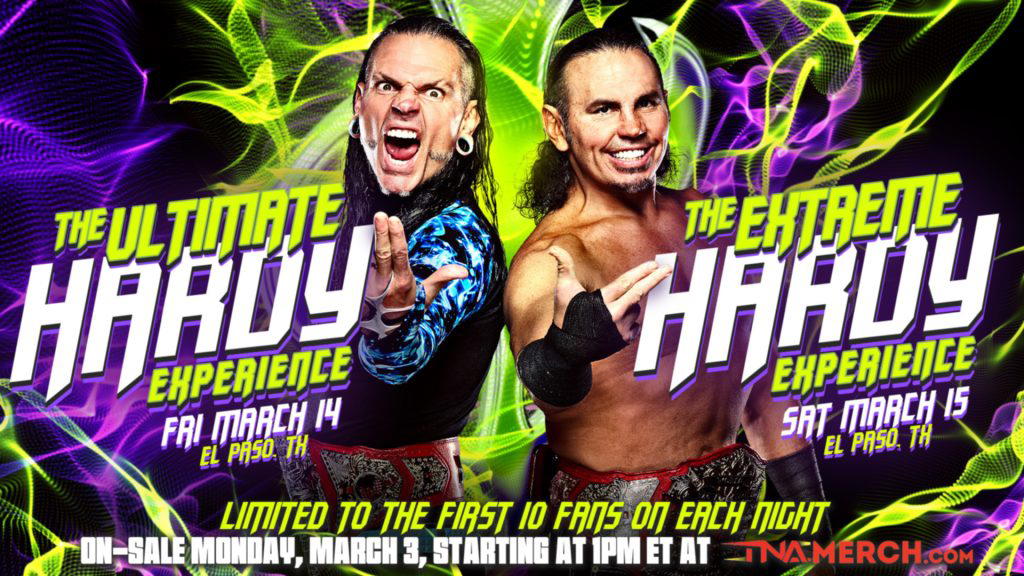 The Ultimate Hardy Experience & The Extreme Hardy Experience will each be limited to 10 fans per night. Here’s a look at the perks for each night, which include appearing in a TNA television segment with Matt and Jeff Hardy:
